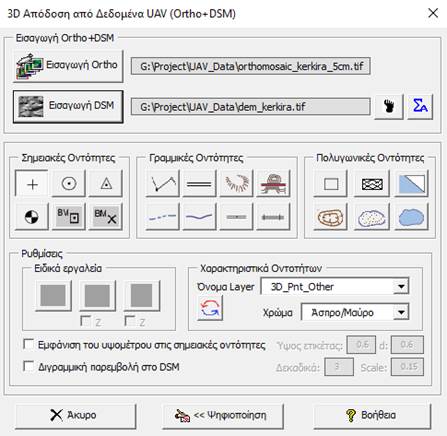 Βοήθεια για DelSurveyCadΜε το εργαλείο 3D απόδοση από δεδομένα UAV, έχουμε τη δυνατότητα να πραγματοποιήσουμε τρισδιάστατη απόδοση των αντικείμενων, χρησιμοποιώντας ταυτόχρονα το μωσαϊκό των ορθοεικόνων και το DSM (ψηφιακό μοντέλο επιφανείας), τα οποία αποτελούν προϊόντα της φωτογραμμετρικής επεξεργασίας των εικόνων, που πάρθηκαν από UAV.