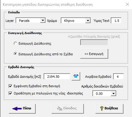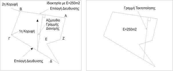 Πρώτα δίνουμε την διεύθυνση που θα κινηθεί η αρχή της γραμμής διανομής και μετά τις κορυφές της ιδιοκτησίας (Γ) <n>, (Β) <e> και την διεύθυνση όπου θα κινηθεί η ευθεία για να βρει Εμβαδόν =250 m2.