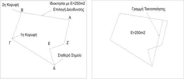 Πρώτα επιλέγουμε με το σταθερό σημείο (Δ) και μετά τις κορυφές της ιδιοκτησίας, ήτοι (Γ) <n>, (Β) <e> και την διεύθυνση όπου θα κινηθεί η ευθεία για να βρει Εμβαδόν =250 m2