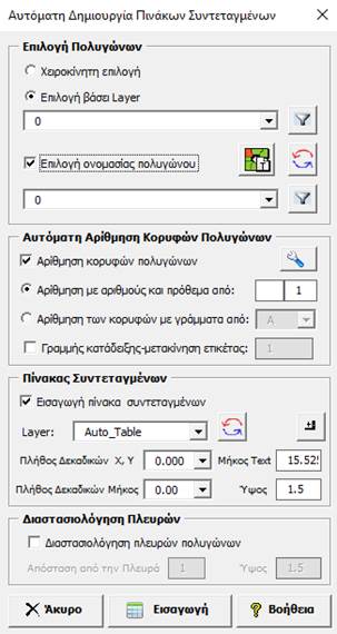 Οι ενέργειες για την αυτόματη αρίθμηση και σχεδιασμό των πινάκων συντεταγμένων, εκτελούνται με τη σειρά που παρουσιάζονται: