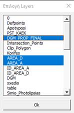 Ορίζουμε τον τρόπο που θα επιλεγούν τα πολύγωνα – γεωτεμάχια. Η επιλογή μπορεί να γίνει είτε χειροκίνητα, είτε επιλέγοντας το Layer(s) που περιλαμβάνονται τα γεωτεμάχια. Εάν επιλέξουμε βάσει του Layer τότε ανοίγονται οι παρακάτω δυνατότητες: