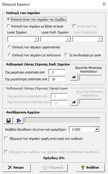 Από το «Επιλογή Σημείων» καθορίζουμε τον τρόπο που θα επιλεγούν τα σημεία καθώς και οι κωδικοί τους. Εφόσον επιλέξουμε «Επιλογή των Σημείων με βάση το Layer», μπορούμε να επιλέξουμε να γίνει επιπλέον και η αναγνώριση των υψομέτρων εφόσον τα σημεία είναι 2D και το υψόμετρο του σημείου αναφέρεται σε κάποιο label.