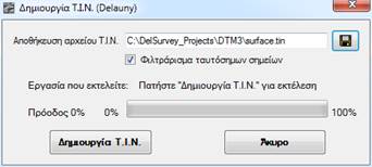 Δίνουμε το αρχείο που θα αποθηκευτεί η επιφάνεια ΤΙΝ και πατώντας Δημιουργία ΤΙΝ δημιουργείται η επιφάνεια από όλα τα διαθέσιμα σημεία.