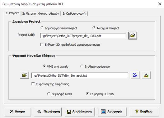 Βοήθεια για DelSurveyCadΗ μέθοδος DLT χρησιμοποιείται συνήθως για την γεωμετρική διόρθωση των αεροφωτογραφιών (1938,1945,1960 κ.α.) ή δορυφορικών εικόνων που δεν γνωρίζουμε επακριβώς τα στοιχεία του εσωτερικού προσανατολισμού (εστιακή απόσταση, πρωτεύων σημείο κ.α.), ώστε να εφαρμόσουμε την αυστηρή φωτογραμμετρική επεξεργασία. Το ψηφιακό μοντέλου εδάφους Ψ.Μ.Ε. (DTM) μπορούμε να το εισάγουμε από την εφαρμογή DelTerrain.