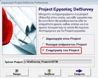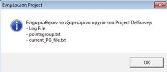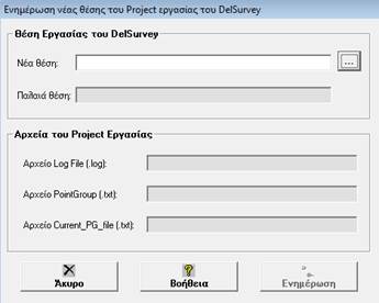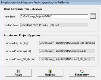 Βοήθεια για DelSurveyCadΕάν το project εργασίας έχει μεταφερθεί από την αρχική θέση στην οποία δημιουργήθηκε σε κάποια άλλη θέση (π.χ. σε άλλο φάκελο, ή δίσκο, ή Η\Υ), τότε απαιτείται να γίνει ενημέρωση του project εργασίας, σχετικά με τη νέα θέση που έχει μεταφερθεί και ταυτόχρονα να ενημερωθούν όλα τα εξαρτώμενα αρχεία του project εργασίας. Τα εξαρτώμενα αρχεία σε ένα project εργασίας του DelSurvey Cad, είναι, α) το αρχείο log του project εργασίας το οποίο περιέχει τη διαδρομή (path) του project εργασίας, β) το αρχείο pointsgroup.txt, το οποίο περιέχει τις διαδρομές (paths) των αρχείων με τις συντεταγμένες των κορυφών που ανήκουν στο Point Group , εφόσον έχουμε δημιουργήσει Point Group και γ) το αρχείο current_PG_file.txt, το οποίο περιέχει τη διαδρομή (Path) του τρέχοντος αρχείου με τις συντεταγμένες των κορυφών, όπως το είχαμε καθορίσει από την εφαρμογή διαχείριση του Point Group.