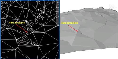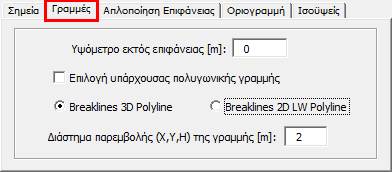 Εισαγωγή Hard Breaklines. Η εισαγωγή γίνεται είτε σχεδιάζοντας τη γραμμή, είτε επιλέγοντας την, εάν υφίσταται στο σχέδιο εφόσον επιλέξουμε την αντίστοιχη επιλογή στις ρυθμίσεις. Η μορφή της γραμμής καθορίζεται από τις ρυθμίσεις. Το διάστημα παρεμβολής της γραμμής δίνεται από τις ρυθμίσεις. |