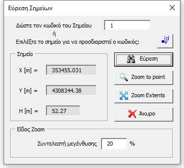 Υπάρχει δυνατότητα αναζήτησης σημείου εντός του σχεδίου πατώντας το «Εύρεση Σημείου» όπου εμφανίζεται η παρακάτω φόρμα: