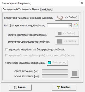 Αρχικά ορίζουμε τα Layers και τα χρώματα στα οποία θα σχεδιαστούν, η γραμμή προβολής (τομής) της επιφάνειας σχεδιασμού στη φυσική επιφάνεια και η διαμορφωνομένη επιφάνεια (επιφάνεια σχεδιασμού).