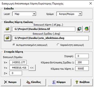Εισάγουμε την κλίμακα του χάρτη-εικόνα οδηγού, που θα εισαχθεί στο σχέδιο. π.χ. εάν το σχέδιο εκτυπωθεί σε κλίμακα 1:500 και ο χάρτης-εικόνα σε κλίμακα 1:5.000 τότε δίνουμε τις αντίστοιχες κλίμακες στα αντίστοιχα πεδία.