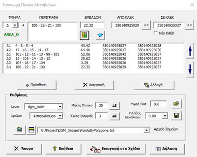 Από τις Ρυθμίσεις μπορούμε να εισάγουμε το όνομα του Layer που θα εισαχθεί ο πίνακας μεταβολών, το χρώμα, το μήκος του πίνακα, το ύψος της γραμμής καθώς και το ύψος της γραμματοσειράς.