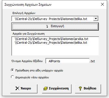 Εάν έχουμε εισάγει πολλά αρχεία σημείων (π.χ. Στάσεων, ταχυμετρικών σημείων κ.α.) μπορούμε να τα συγχωνεύσουμε, με σκοπό να δημιουργήσουμε ένα ενιαίο αρχείο με σκοπό π.χ. να το χρησιμοποιήσουμε για την δημιουργία ΨΜΕ η δημιουργία ισοϋψών. Επιλέγουμε «Συγχώνευση Αρχείων» και εμφανίζεται η παρακάτω φόρμα: