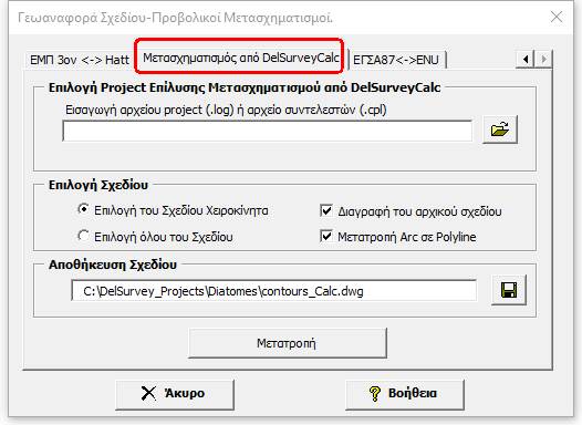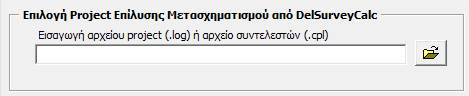 Επιλέγουμε το Project του μετασχηματισμού ή το αρχείο συντελεστών (.cpl) που έχει υπολογιστεί από το DelSurveyCalc όπως μετασχηματισμό ομοιότητας, αφινικό ή πολυωνυμικό.