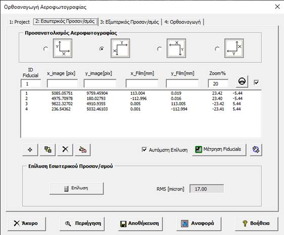 Επιλέγουμε τον προσανατολισμό της αεροφωτογραφίας όπως αυτό μας δίνεται από το calibration report της φωτομηχανής.