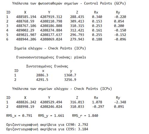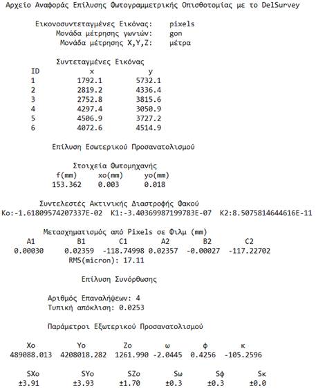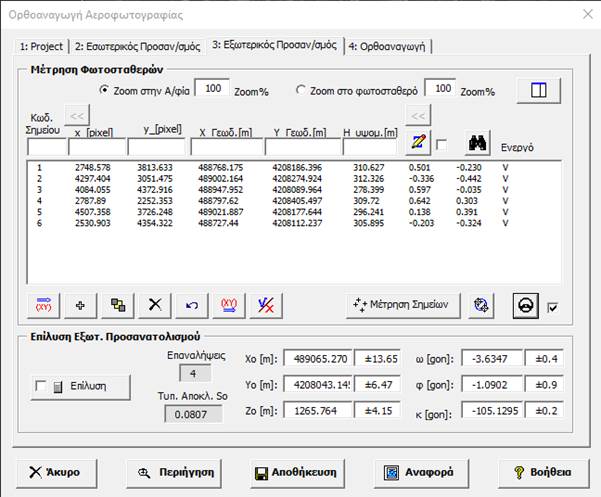 Πατάμε «Επίλυση» και μας δίνονται οι λύσεις των στοιχείων του εξωτερικού προσανατολισμού της αεροφωτογραφίας καθώς επίσης και η τυπική απόκλιση της λύσης. Για κάθε μέτρηση φωτοσταθερού μας δίνονται και τα υπόλοιπα (residuals) που προκύπτουν από την επίλυση.