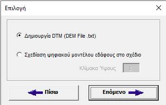 Μπορούμε να επιλέξουμε τη δημιουργία αρχείου Δημιουργία DTM (DEM File .txt) ή να σχεδιαστεί το Ψ.Μ.Ε στο σχέδιο.