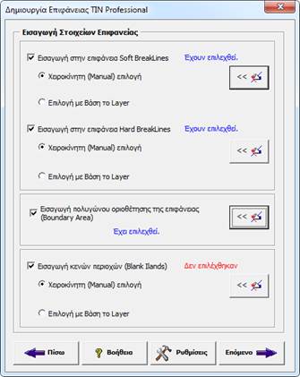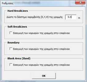 Επιλέγουμε το βήμα παρεμβολής που θα πραγματοποιηθεί κατά μήκος της Hard Breakline, καθώς επίσης και εάν θέλουμε να εισαχθούν ως σημεία στην επιφάνεια οι κορυφές των πολυγώνων, όπως του πολυγώνου οριοθέτησης (Boundary), αλλά και των πολυγώνων που περικλείουν περιοχές που δεν θα δημιουργηθεί επιφάνεια (Blank Area or ιlands).