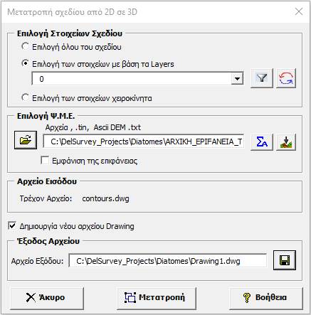 Μπορούμε να μετατρέψουμε οντότητες cad από 2D σε 3D. Η παραπάνω εφαρμογή χρησιμοποιείται όταν θέλουμε να δώσουμε την πληροφορία του υψομέτρου στις οντότητες του σχεδίου, όπως κορυφές ιδιοκτησίας, όρια κ.λ.π. Οι οντότητες θα πρέπει να μπορούν να εισάγουν 3D πληροφορία. Π.χ. θα πρέπει να είναι 3d polyline και όχι LWPolyline. Μπορούμε να μετατρέψουμε τις οντότητες από LWPolyline σε 3D Polyline από το εργαλείο Μετατροπές