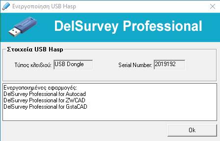 Βοήθεια για το DelSurveyΕάν έχετε προμηθευτεί κάποιες από τις Professioanal εκδόσεις του DelSurvey , όπως DelSurvey Pro for Autocad, DelSurvey Pro for ZWCAD,DelSurvey Pro for BricsCAD και DelSurvey Pro for GstarCAD, η ενεργοποίησή τους μπορεί να γίνει με χρήση USB κλειδί (Dongle Key), το οποίο προμηθεύεστε μαζί με το πρόγραμμα. Επιλέγοντας τη χρήση USB κλειδιού μπορείτε να εγκαταστήσετε το πρόγραμμα σε πολλούς υπολογιστές (σταθμούς εργασίες) πλην όμως λειτουργεί μόνο στον υπολογιστή που βρίσκεται το κλειδί USB.