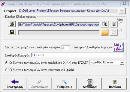 Βοήθεια για το DelSurveyΗ συνόρθωση τρισδιάστατου δικτύου εφαρμόζεται σε γεωδαιτικό δίκτυο που το μήκος των χωρικών πλευρών (Βάσεις-Διανύσματα) έχουν προσδιοριστεί είτε γεωδαιτικά GPS είτε με laser. H συνόρθωση 3D δικτύου γίνεται με γνωστά προσανατολισμένα διανύσματα στο χώρο.
