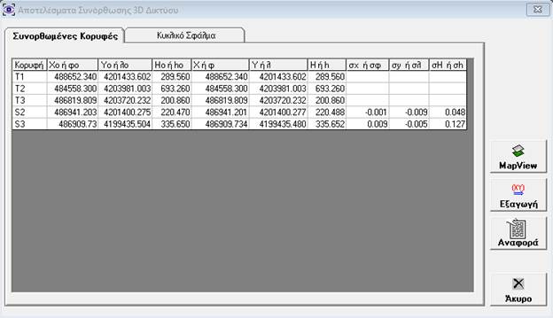 Πατώντας ΟΚ εμφανίζονται τα αποτελέσματα της συνόρθωσης του δικτύου σε πίνακα, όπως φαίνεται παρακάτω: