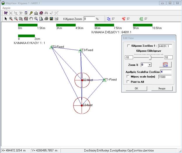 ΠΡΟΣΟΧΗ: Για να δούμε στο MapView σχεδιασμένο το δίκτυο καθώς επίσης και τα κυκλικά σφάλματα θα πρέπει οι συντεταγμένες των κορυφών του δικτύου να είναι σε προβολικό σύστημα (Χ,Υ) και όχι σε μορφή γεωγραφικών φ και λ.