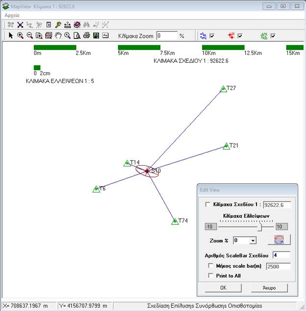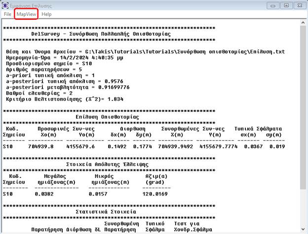 Πατώντας MapView μπορούμε να δούμε τη γεωμετρία της οπισθοτομίας καθώς και το σφάλμα της έλλειψης: