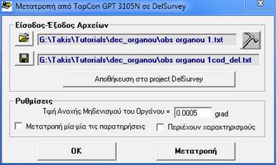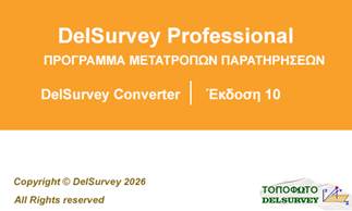 Βοήθεια για το DelSurveyΗ εφαρμογή Del Converter χρησιμοποιείται για την μετατροπή των αρχείων των πρωτογενών μετρήσεων, που έχουν δημιουργηθεί από γεωδαιτικούς σταθμούς (Total Station), σε format DelSurvey. Η εφαρμογή έχει δυνατότητα μετατροπής πληθώρας οργάνων, πλην όμως υπάρχει η δυνατότητα να αναπτυχθεί νέα ειδική εφαρμογή που να διαβάζει οποιοδήποτε format γεωδαιτικού σταθμού, όπως και αν έχει αυτό διαμορφωθεί από το χρήστη. Η εκκίνηση της εφαρμογής γίνετε από το «DelConverter».