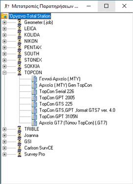 Επιλέγουμε από τη λίστα το όργανο που διαθέτουμε ή τη διαμόρφωση που έχει το αρχείο μετρήσεων του γεωδαιτικού σταθμού. Παράδειγμα επιλέγοντας «TopCon GPT 3105N» και πατώντας διπλό κλικ η κάνοντας δεξί κλικ Άνοιγμα εφαρμογής εμφανίζεται η παρακάτω φόρμα: