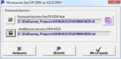 Βοήθεια για το DelSurveyΜία συνηθισμένη μορφή αρχείων που περιέχουν υψομετρικά δεδομένα και χρησιμοποιούν τα περισσότερα λογισμικά γεωπληροφορικής (QGIS κ.α.) αλλά και το Ελληνικό Κτηματολόγιο είναι η μορφή GeoTiff 32bit Float, όπου αποτελεί πινακοποιημένη εικόνα, η οποία περιέχει γεωαναφορά και κάθε pixel της αντιπροσωπεύει την τιμή του υψομέτρου. Το βήμα καταγραφής του υψομέτρου δίνεται από την ανάλυση της εικόνας (Pixel size). Το DelSurvey έχει τη δυνατότητα να μετατρέπει την εικόνα Geotif 32bit float σε αρχείο ASCII DEM GRID το οποίο μπορεί να χρησιμοποιηθεί σε όλες τις εφαρμογές του DelSurveyCad που απαιτούν υψομετρικά δεδομένα (Εισαγωγή Επιφάνειας - Δημιουργία Ισοϋψών από Επιφάνεια - Χρωματική οπτικοποίηση Επιφάνειας - Κλίσεις Επιφάνειας - Προσανατολισμός επιφάνειας - 3D Ανάλυση Επιφάνειας - Μηκοτομή από ΨΜΕ - Ογκομετρήσεις με διατομές “κατά μήκος οδού” - Ορθοαναγνωγή Αροφωτογραφιών- Ορθοαναγωγή Αεροφωτογραφιών με DLT κ.α).