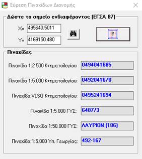 Βοήθεια για το DelSurveyΤο εργαλείο Πινακίδες Διανομής χρησιμοποιείται για να πληροφορηθούμε για κάποιο συγκεκριμένο σημείο Χ,Υ (σε ΕΓΣΑ-87) σε ποια πινακίδα διανομής περιλαμβάνεται. Οι διανομές που εξετάζονται είναι αυτές που εμφανίζονται στην παρακάτω φόρμα: