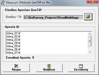 Επιλέγουμε τις εικόνες και πατάμε εκτέλεση για α εξαχθούν τα αρχεία *.tfw για κάθε εικόνα τα οποία θα βρίσκονται στην ίδια θέση που βρίσκεται και το αρχείο εικόνας.
